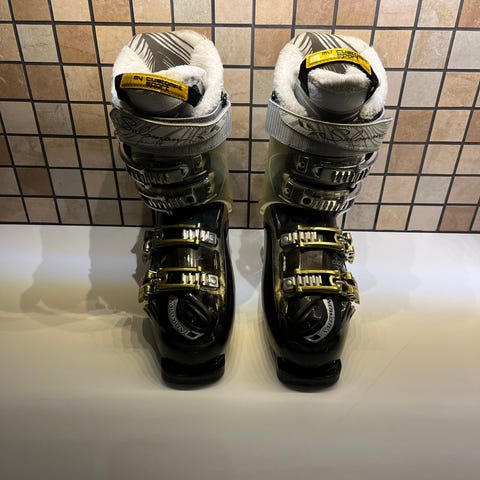 Salomon alpin støvle flex 100, størrelse 27-27,5 længde 317mm. Jeg bruger størrelse 42-43 i sko. Støvlerne har flere spænder for justering og er designet til at give støtte og kontrol ved skiløb. Der er lagt en bedre sål i end den der medfulgte. Ingen defekter.
