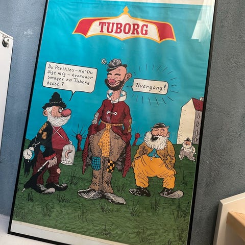Tegneserie plakat med tre forskellige karakterer, hvoraf den ene bærer en rød trøje og gul bukser, den anden har en sort hat og rød jakke, og den tredje er iført gul dragt. Plakaten er indrammet med sort ramme og har en blå baggrund.