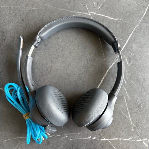 JLab DJ ESS Studio trådløse hovedtelefoner med over-ear design. Farve: grå og blå. Inkluderer en blå bærbar højttaler, en blå lydkabel og brugervejledning. Hovedtelefonerne er beregnet til trådløs brug og har justerbar hovedbøjle.