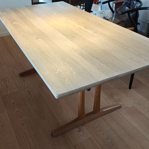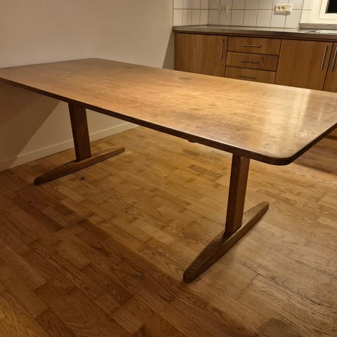 Spisebord I eg. Stellet er massivt og bordpladen fineret. Bordet er i meget fin stand. ingen mærker eller skjolder på bordpladen, da det for det meste har været dækket af voksdug. Bordet står i Kalundborg.