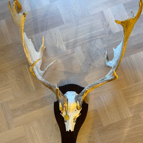 Antilop gevir monteret på en sort plade. Geviret har to lange, snoede horn og en hvid kranie. Velegnet til vægdekoration.
