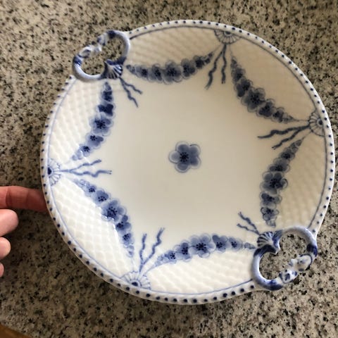 Rektangulært fad ca 25x30 cm og to små asietter med diameter ca 9,5 cm. Ingen skår. Samlet pris for alle tre dele.