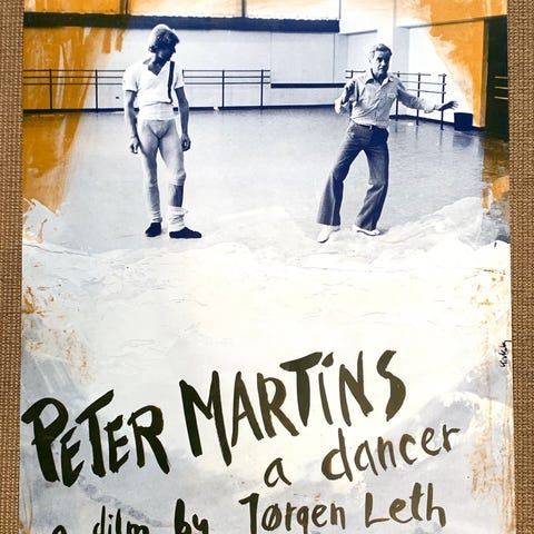 Per. Kirkeby. Step on Silence film plakat af Jørgen Leth. Plakaten har et kunstnerisk motiv med blå og hvide farver, der forestiller en scene fra filmen. Tekst på plakaten inkluderer navne som Suzanne Farrell, Peter Martins og New York City Ballet. Plakaten Måler. 85 højden 62 breden.
