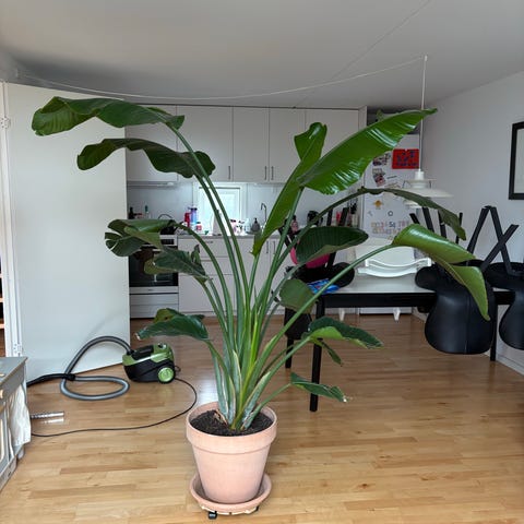 Strelitzia Nicolai stueplante med store grønne blade placeret i en sort potte. Planten har en højde og bredde, der gør den velegnet som dekorativ grøn plante i hjemmet eller kontormiljøer.