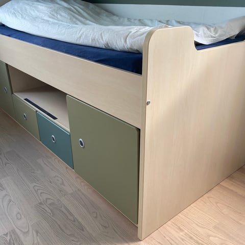 90x200 cm. Velholdt halvhøj seng med praktisk opbevaring, nyere madras og nyere topmadras. Fra røg- og dyrefrit hjem. Inkl. sengehest. Ekskl. kurve og kasser etc. Sengen er skilt ad og lige til at tage med.