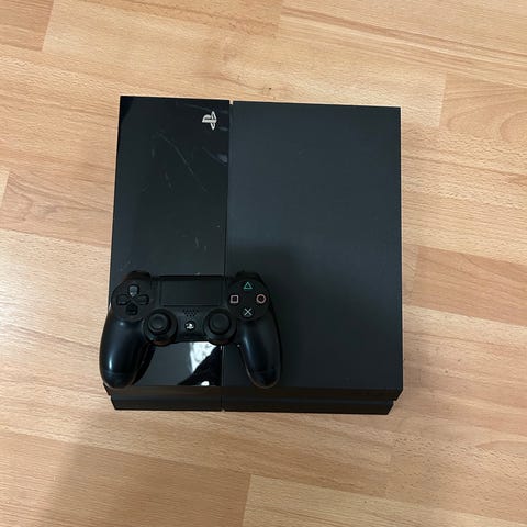 Sony Playstation 4 spillekonsol leveres med to controllere og inkluderer en spilpakke med ti spil. Konsollen er sort og kommer med nødvendige kabler og delvist original emballage.