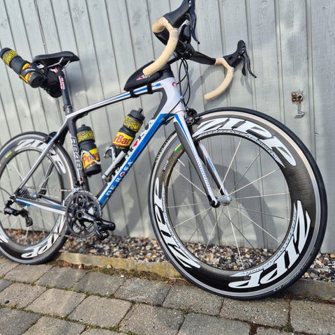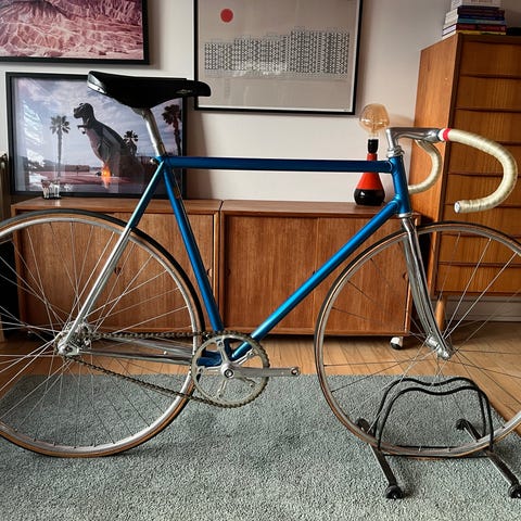 Jeg sælger en af mine absolutte rariteter. Passer perfekt ind i en cykelelskers samling. Bo Hamburgers gamle Forum seksdagesløb banecykel. Gazelle ramme bygget personligt til Bo Hamburger. Overrør måler 54cm m/m, saddelrør 52cm m/m. Bygget op med Dura-Ace krank sæt, saddelpind og nav med Wolber 20 fælge. Cinelli Pista styr og frempind og Concor saddel (disse ikke originale tror jeg - dog var krank sæt og saddelpind med da jeg oprindeligt købte stellet). Jeg har haft cyklen i over 15 år, men nu skal den videre.