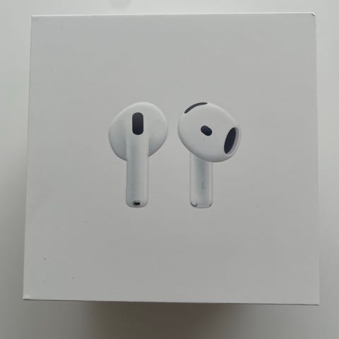 Apple AirPods 4 headset i hvid farve. Trådløse høretelefoner med opladningsetui. Designet til brug med Apple-enheder.