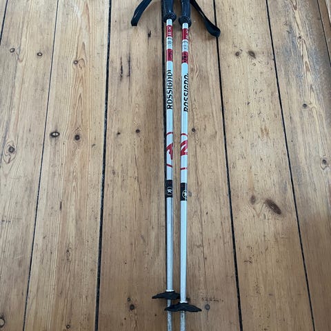 Rossignol skistave med en længde på 115 cm. Stavene er designet til skibrug og har håndtag med stropper for bedre greb. Materialet er metal, og de har spidser med skærme.