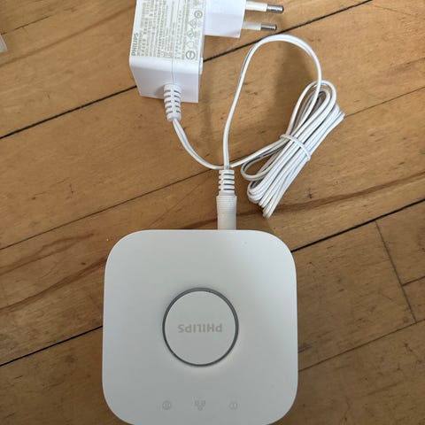 Philips Hue Broderick Gateway med tilhørende strømforsyning. Enheden understøtter WiFi-forbindelse og fungerer som central hub til Philips Hue belysningssystem. Produktet har en hvid farve og er designet til indendørs brug.