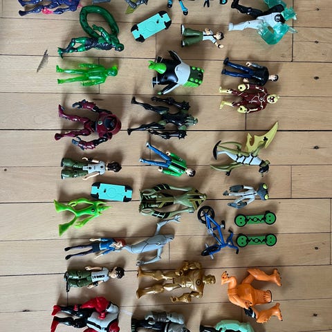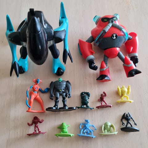 Sæt med 7 Ben 10 figurer og en kæmpe myre (ukendt mærke). Den store Ben 10 er ca. 25 cm høj (actionfigurstørrelse). Alle figurer (på nær myren) har bevægelige dele). Sælges samlet.