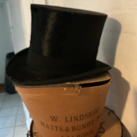 Fin høj hat i æske fra Brødrene Andersen. Rigtig god stand.indvendige mål er 17,5 x 21 cm.