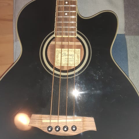 Blå Ibanez milestobe bas med hvid (og løs) pickguard.