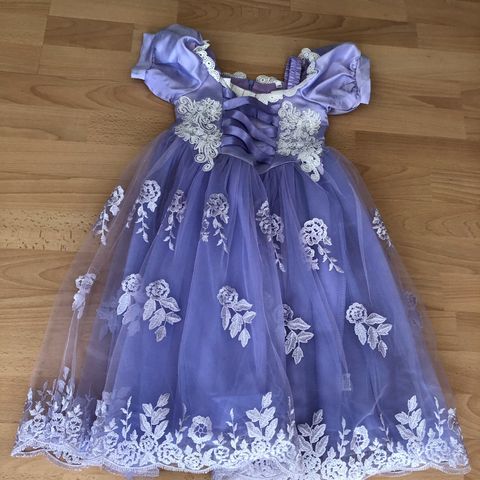 Kjolen kan udvides i toppen og passer derfor i str. 4-7 år. Standen er næsten som ny. Kjolen har fine detaljer som bindebånd i toppen, og masser af tyl.