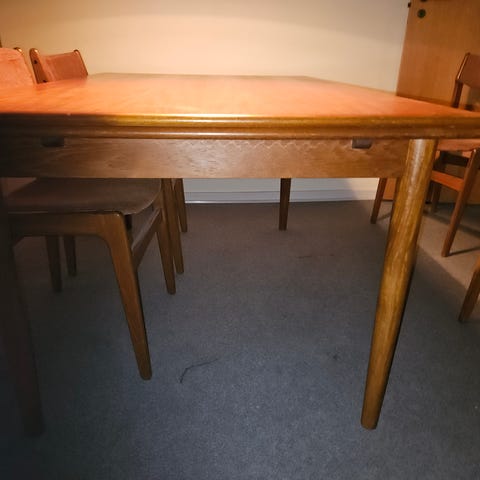 Dertil 6 spisebordsstole med ryglæn i teak og stel i bøg (tror jeg)