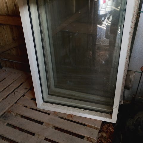 2 stk vinduer i træ, hvidmalet med skrå top 25 gr.
