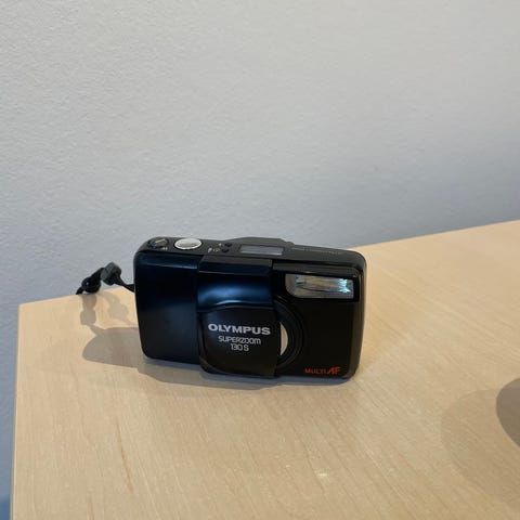 Olympus super zoom 70 kamera med tilhørende taske. Kameraet er kompakt og velegnet til fotografi med manuel fokus og indbygget blitz. Tasken er designet til at beskytte kameraet under transport.