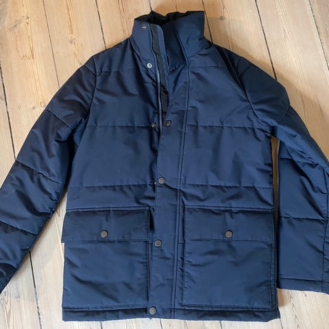 Marine blå vinter jakke. Farven er “løbet” ved højre skulder. Der er ikke hul. Se billede