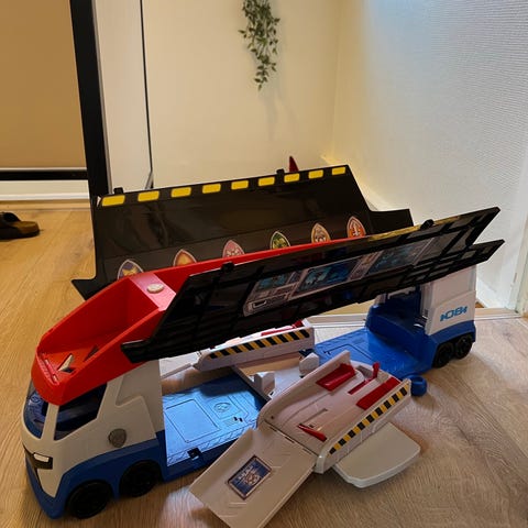 Paw Patrol legetøjslastbil med åbne sider og rampe, designet til leg og opbevaring af figurer eller biler. Lastbilen har en rød, hvid og blå farve og er fremstillet i plastik. Den har funktionelle dele som åbne sider og en udtrækkelig rampe, der giver mulighed for interaktiv leg. Den virker som den skal med lyd. Rampen kan skyde bilerne ud og der kan være 5-6 biler i alt.