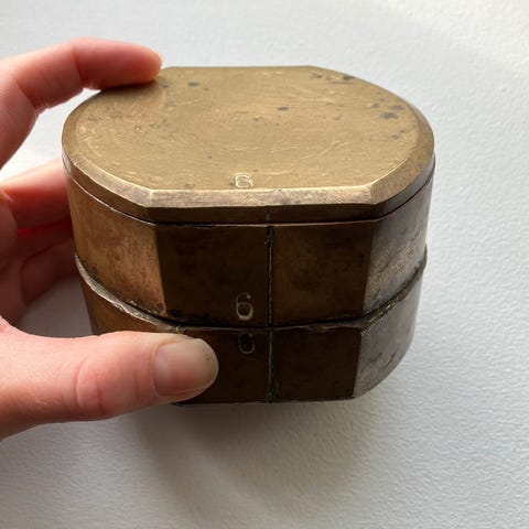 Tror det er massiv messing 🤔 vejer 9,5 kg. Sender gerne