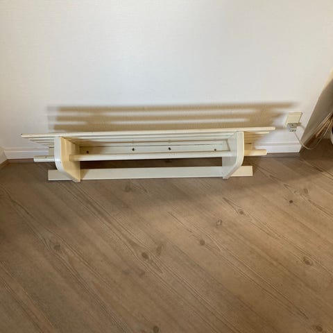 En funktionel hattehylde med knagerække a' 7 knager og bøjlestang. Ubehandlet fyrretræ. Pris fra ny 779 kr.