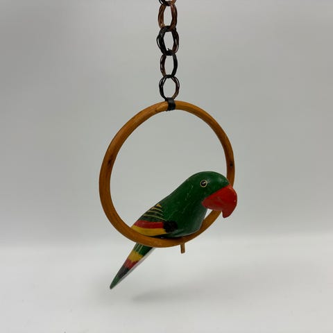 Fin håndlavet papegøje i træ til at hænge op og pynte i dit hjem, fx som et friskt pust i børneværelset eller udestuen.