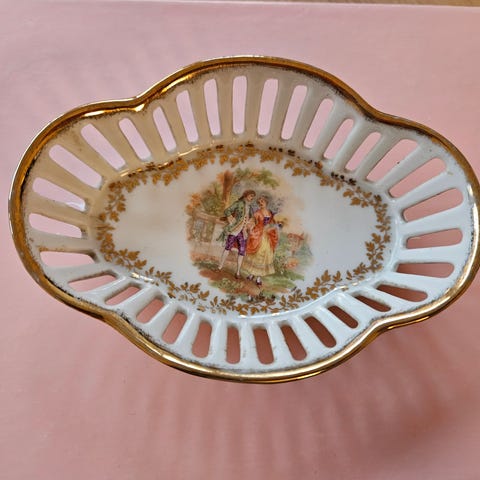Vintage Germany porcelæn fad med dekorative blomster og guldkant. Fadet har en unik form med buede kanter og er hvidt med flerfarvede blomsterdekorationer. Materialet er porcelæn, og det kan anvendes til servering eller som dekorativt element.