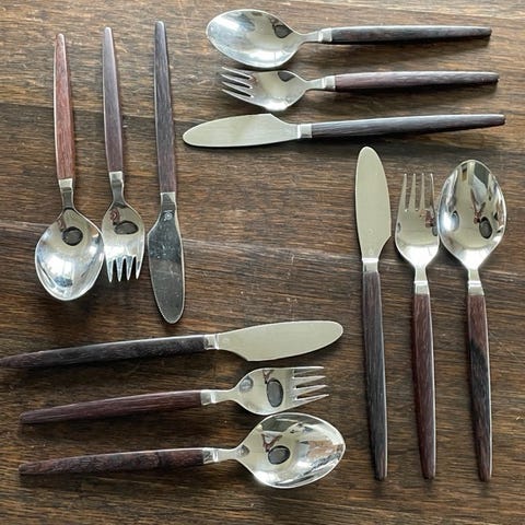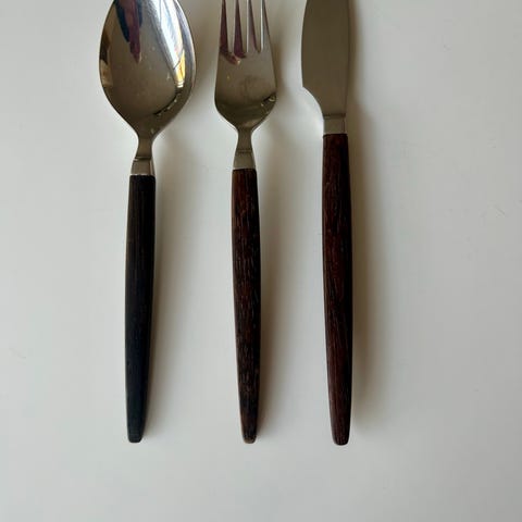 Sjældent og meget velholdt ETON serveringsbestik i rustfrit stål med palisanderskafter, produceret af Raadvad i Danmark ca. 1960’erne.