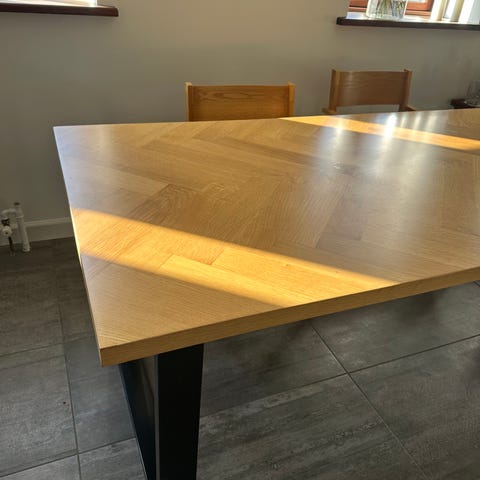 Flot plankebord, 2 lange planker og kraftig bordplade 4cm, mørk eg