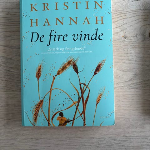 Kristin Hannah Nattergalen bog. Roman fra 2015, dansk udgave. Bogens omslag viser en kvinde på en cykel i marklandskab. Historien foregår under Anden Verdenskrig og omhandler to søstre i Frankrig.