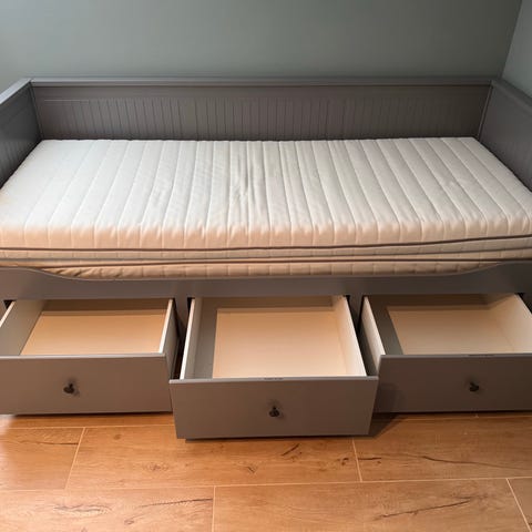Seng med 2 skuffer. Madrassen trænger til rens/udskiftning. Den ene lamel er knækket. Ellers en fin seng