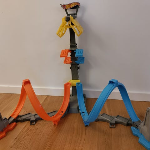 Sjovt sæt hvor bilen suser gennem loopet og forsøger at lande i det justerbare bur helt op til 60 cm i luften. Nem opsætning, og kan pakkes sammen så det fylder mindre.