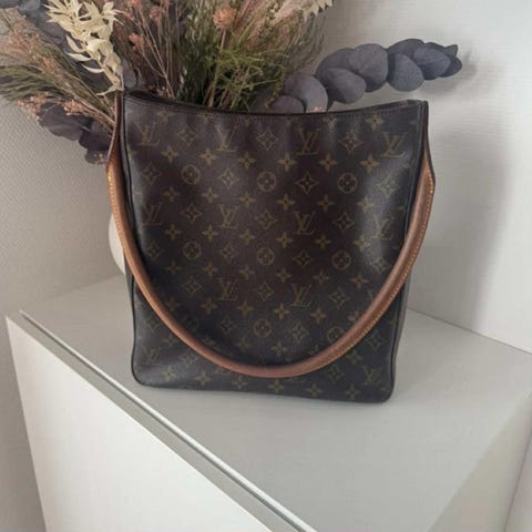 Louis Vuitton skuldertaske i læder til kvinde med monogrammønster og dekorative patches. Tasken har en lynlåslomme på bagsiden, justerbar skulderrem og metalhardware. Indvendig foret med tekstil i pink farve. Fremstillet i Frankrig.