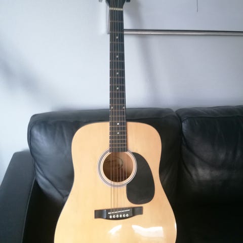 Bristol BM-16B akustisk guitar i sort farve. Guitarens krop og hals er lavet af træmaterialer, designet til akustisk lydproduktion. Lækker guitar. Meget lidt brugt. Fra hjem uden røg og husdyr. Nypris 3.000 kr.