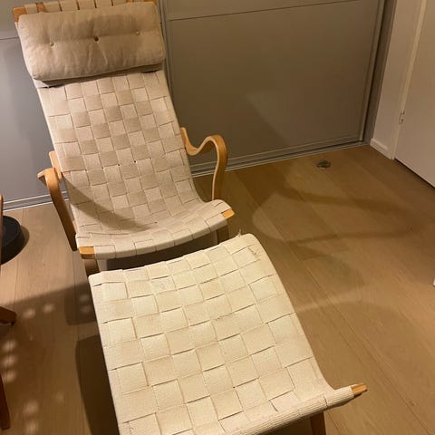 DUX Bruno Mathsson lænestol med stel i lyst træ. Lænestolen har en høj ryg og buede armlæn, designet til komfort og støtte.