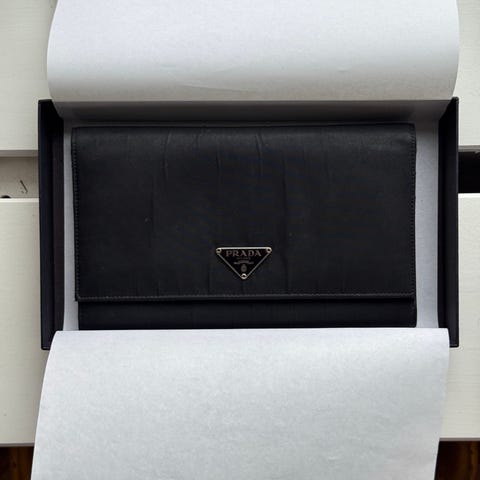 Prada stof taske til kvinde i sort farve. Tasken har justerbar rem og flere lynlåslommer, hvilket giver praktisk opbevaringsplads. Indvendigt mærke med Prada logo. Velegnet til daglig brug.