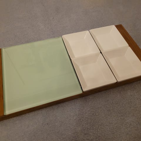 Trip Trap krummebræt i træ med udskåret gittermønster på låget. Materialet er naturligt træ, og æsken har et enkelt, funktionelt design.