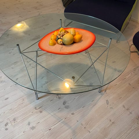 Sofabordet med rund glasplade ø 120 og stel af træ. Bordet har et moderne design med fire ben, der mødes i midten for stabilitet. + 3 lænestol med sort læder.