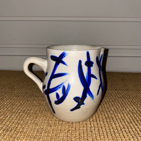 MK Keramik kande med hank, håndmalet med dekorative mønstre i brune og beige nuancer. Kanden har et unikt design med detaljeret maling og er fremstillet i keramik.