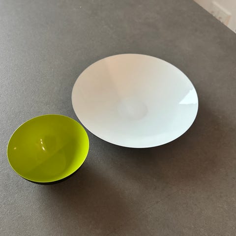 Normann Copenhagen skål med sort yderside og støvet grøn inderside. Skålen har en rund form og er egnet til servering eller opbevaring af mad. Prisen er for begge skåle