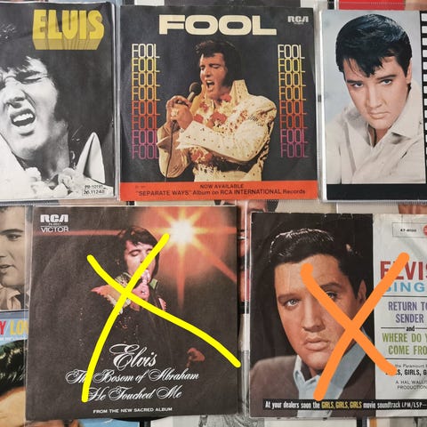 Single-plader uden cover: Only the lonely /When will I be loved. / Are you lonesome to-night / I gotta know / Bossa Nova Baby / Witchcraft / Anything that's part of you, Make me know it. His last flame / Little Sister, King of the whole wide world/ Home is where the heart is, Hard headed woman/ Don't ask me why, Blue Moon/ Just because, Lonely Man/ tornaa surriento, Wild in the country/ I feel so bad. Pris pr. stk. 50 kr. Mindstesalg er 3 stk. Alle 14 singler samlet : 500 kr. Foto 8487K.