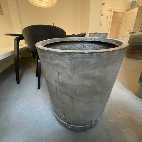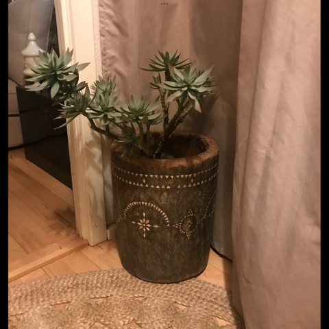 Stor krukke i jordbrune nuancer med opstammet Ficus Audrey.