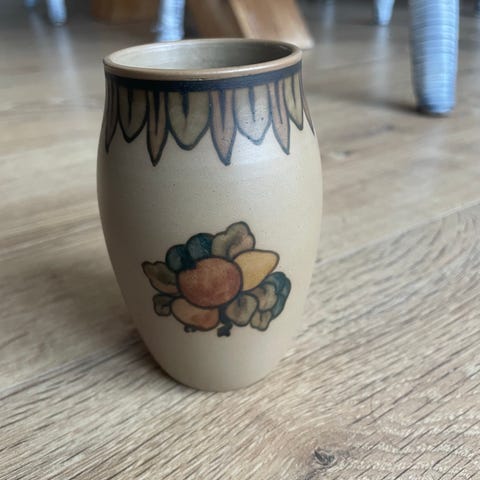 L. Hjorth keramik. Vaser og krukker og tændstiksholder med håndmalet blomsterdekoration. Fremstillet på Bornholm, materialet er keramik med en brunlig glasur og farverige blomsterdetaljer.
