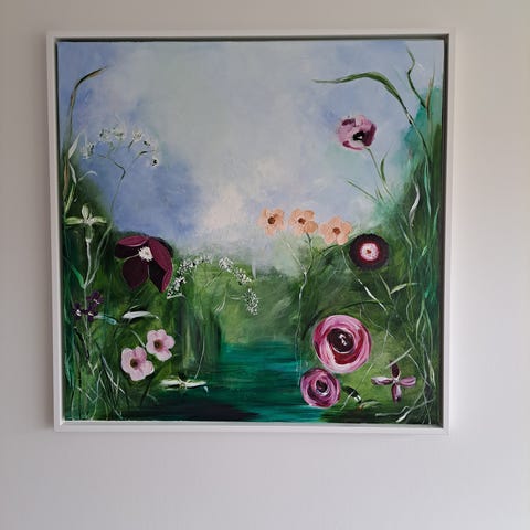 Smukt maleri med rammemål 64 x 64,5 cm i hvid svæveramme. Har været ophængt i røgfrit hjem.