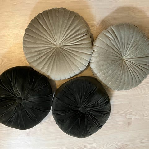 To håndsyede pudepetræk i velour og monteringspuder. Puderne har ikke været brugt, men stået i gæsteværelse. Kan hentes i Greve/Hundige eller i København ved Nytorv.