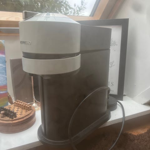 Nespresso kaffemaskine i hvid farve. Maskinen er designet til at brygge espresso og kaffe med kapsler. Den har en kompakt form og inkluderer en mælkeskummer til cappuccino og latte. Maskinen er velegnet til husholdningsbrug.
