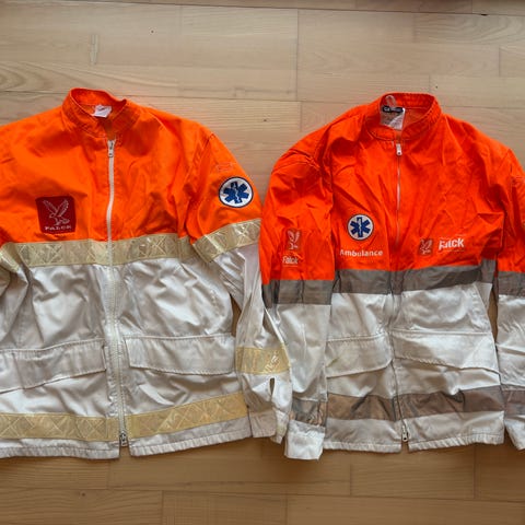 3 Falck arbejdsjakker i rød og blå med reflekser samt rød regnjakke, blå uldtrøje og div. merchandise: tøjdyr, plastikposer mm. Sælges kun samlet.
