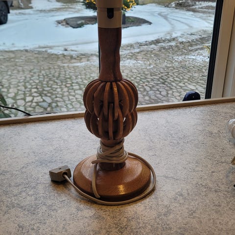 Lampen har en cylindrisk form med en kombination af sort og træfarvet materiale. Velegnet til brug som bordlampe i forskellige rum.