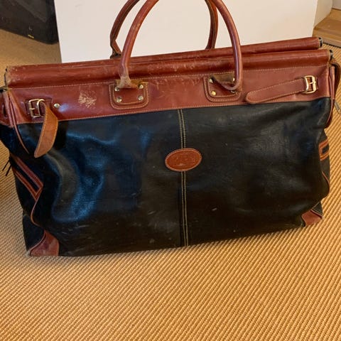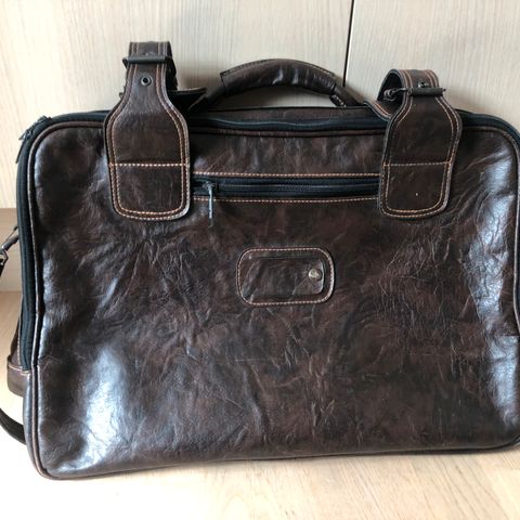 Rumlig weekendtaske i brunt læder. Lukning med lynlås, to små udvendige lommer. Fremstår i nydelig stand men trænger til at par sting i bunden (se billede). Skulderstrop er bortkommet. Fra røg- og dyrefrit hjem.