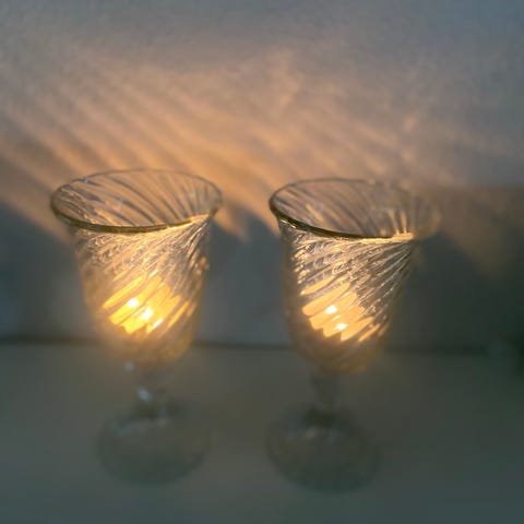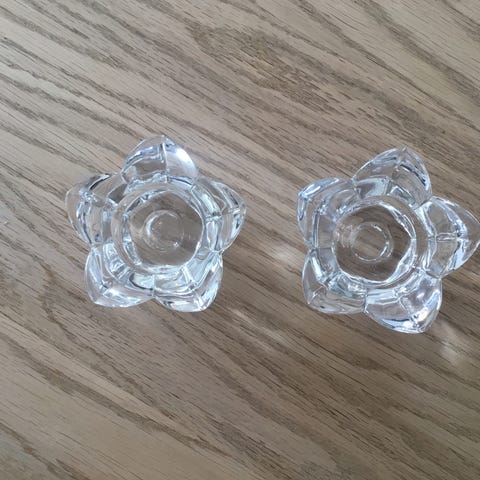 To lysestager af glas i form af åbne blomster: En i klar glas og en i lyserød glas. Kan anvendes som dekorative elementer til borddækning eller som stemningslys.